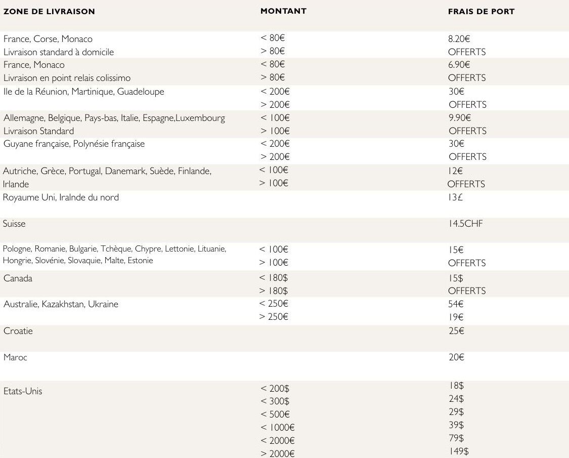 Les prix indiqués ne comprennent pas les frais de transport, de livraison et les droits de douane (sauf pour le Canada et les Etats-Unis) pour autant qu’elles aient lieu dans les zones géographiques prévues ci-après.